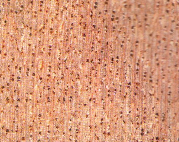 心邊材區(qū)別不明顯。木材淺粉紅褐色至紅褐色。生長(zhǎng)輪略可見(jiàn),不均勻。